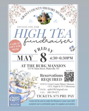 Your Grant County History Museum is hosting on May 8 in the beautiful Burg Mansion in Platteville. It is not only an important fund-raiser for the museum, but a wonderful event that you will want to attend. It provides an opportunity for a Mother’s Day outing for Mothers, daughters, sisters, friends, couples….etc. The experience is heightened because of the beautiful surroundings of the Burg Mansion. You don’t need to go to London for high tea – take advantage of one close to home!